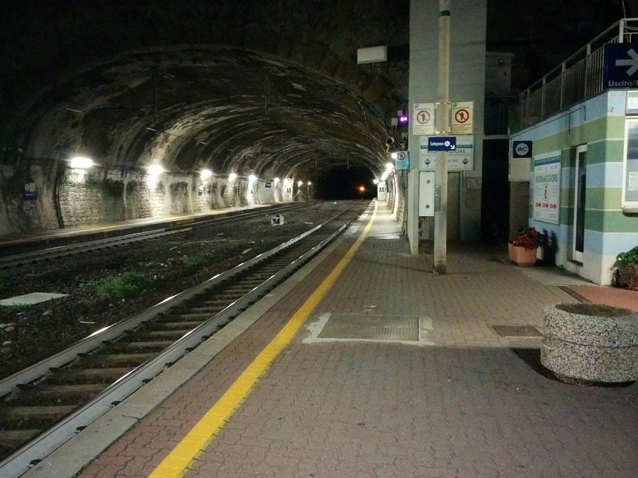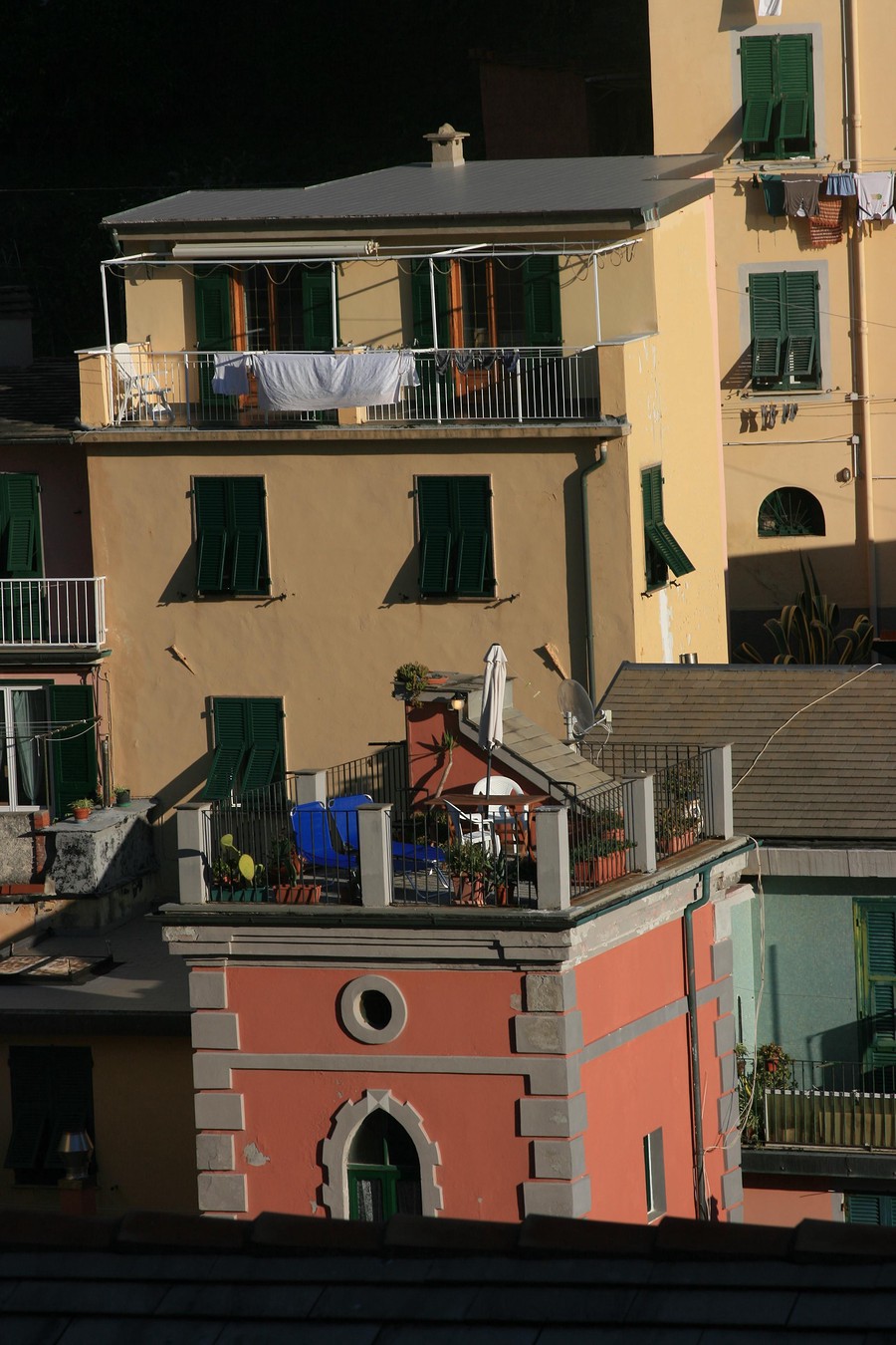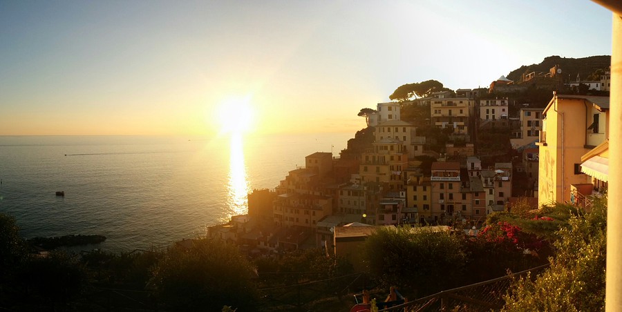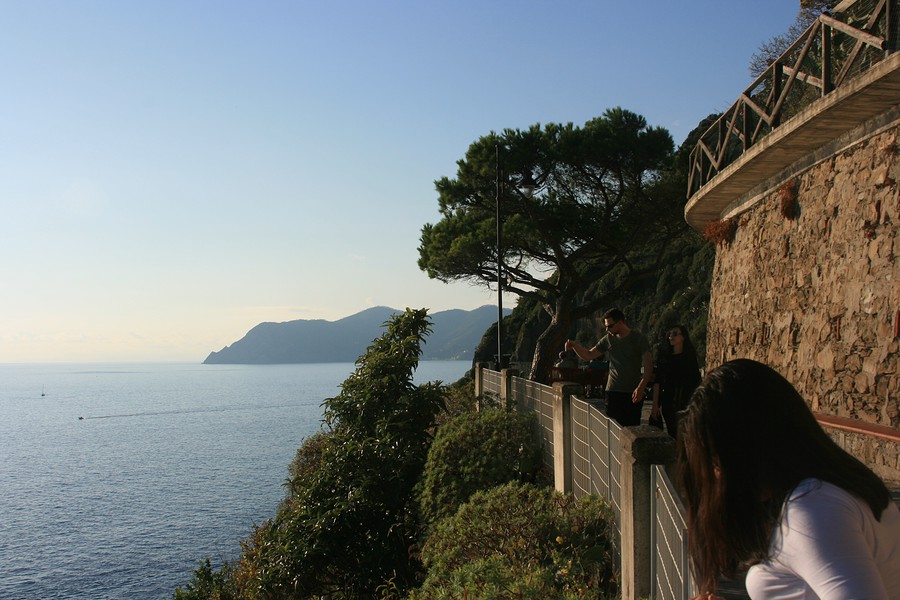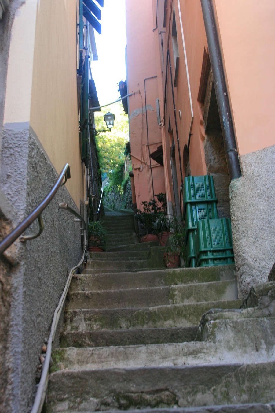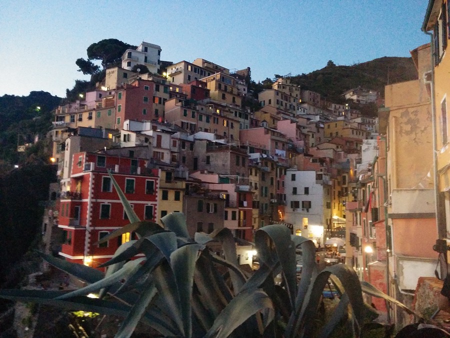 Now we did have to climb lots of stairs to get there, and throughout our time in Cinque Terre. There are tons of stairs there! So our train came in to Riomaggiore and we got out and walked through a tunnel to get to the main part of town. From there we called the hotel and the lady who ran it met us down on the street and led us to the hotel. We dragged our luggage up about 50 steep stairs to get to the front door, and then up another 20 or so to get to our room. That night we went for a walk to explore the town, and discovered how beautiful it was! The views were amazing! We wandered around, going up hundreds of stairs to get to some of the trails up in the hills, we watched the sunset, ate gelato and pizza, and Ziqin ate some seafood sold from a street vendor.