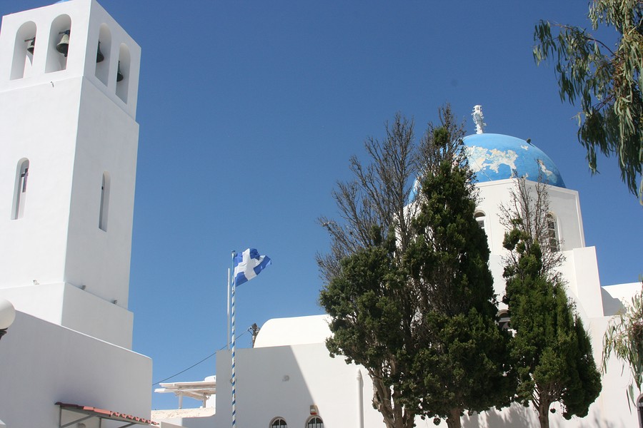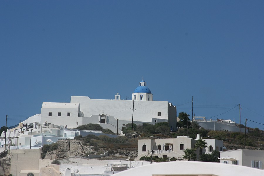 Our second day we got a ride into Fira from the father of the family who run the hotel. Once there we found somewhere to grab lunch, a nice little restaurant that was called Mama’s House I believe. The food was excellent, Greek salads in Greece are amazing by the way! The pasta and bread in Greece are also quite good, and my wife loved the seafood (I don’t really eat seafood myself). The price at this restaurant wasn’t too bad for a restaurant in Fira (it is the most crowded with tourists part of the island). After that we wandered around town a bit, bought some sunscreen for the very white me, ate some ice cream and started heading towards one of those blue-roofed churches to have a look around.