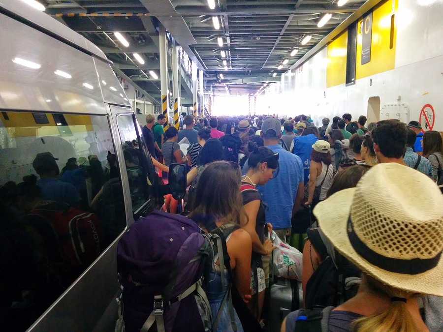 The ferry tickets were 40 EUR (about 50 USD as of this post) per person each way (there are cheaper seats available, and more expensive ones as well, we went for the middle option – what was called air seats). Our ferry left at about 7:20 am. Oh, so if you ever plan on taking this ferry, when you get to the station for the port you first need to go out of the train station and cross the road (you’ll see a pedestrian overpass, or there is also a crosswalk) heading towards the ocean. Once you cross the road turn left and walk until you see an opening into where all the ships are, if you don’t have your ticket yet (or you don’t know which ferry to get on) go to the Blue Star Ferry office that will be left of you if you are facing the ships.