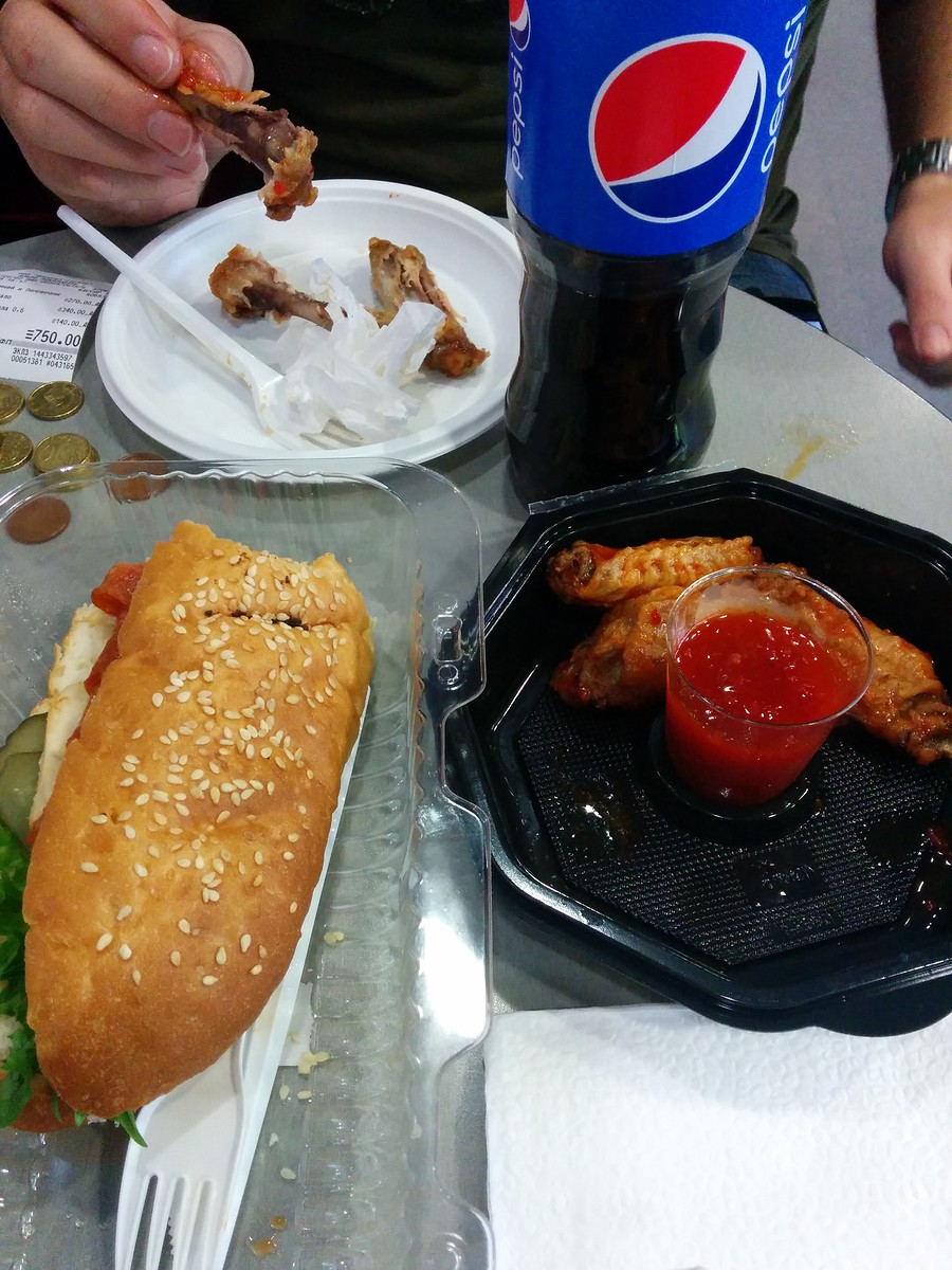 The first meal we had on this trip was at Moscow for our layover. There was not many choices and the price was ridiculous. We shared a sandwich and a plate of chicken wings. The cashier said the meal came with a drink, but after paying 20 euros(27USD) for the food, we did not think the drink made us feel any better.