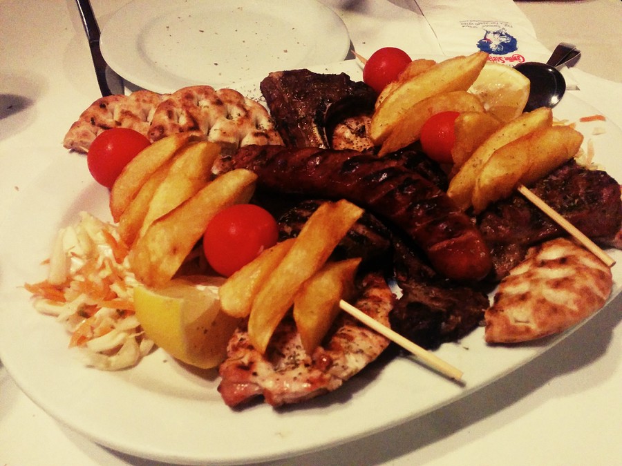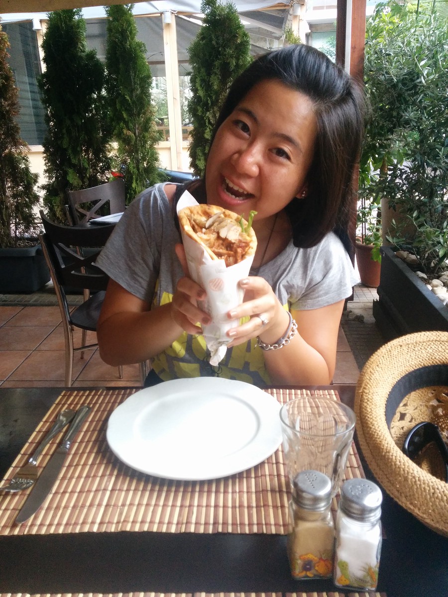 Gyro is the national dish in Greece. To me it is a big pita bread wrap. You have your choice of meat, normally beef, pork or chicken; some places offer more options like fish and shrimps, wrapped in a pita bread with some veggies and french fries! It is filling and tasty. It can be a quick bite or a meal.