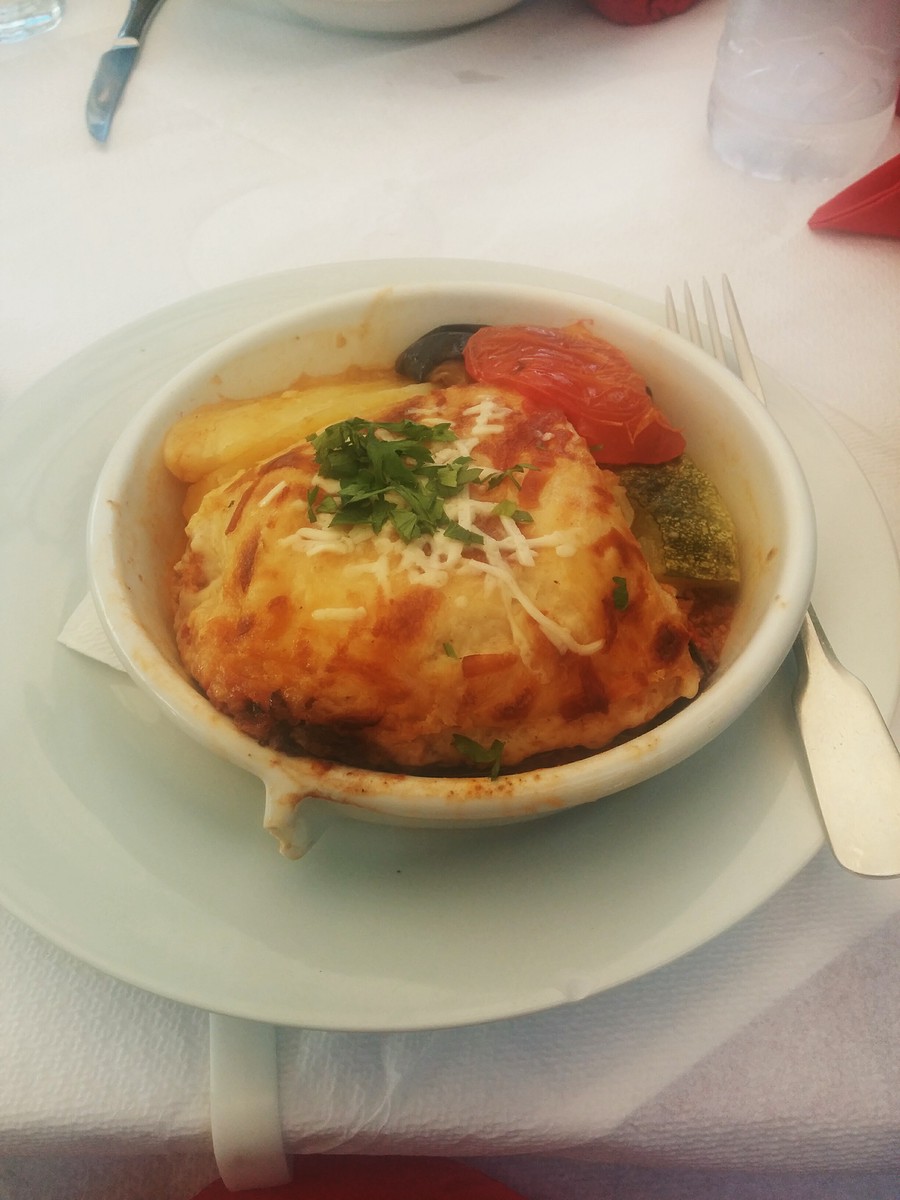 Greek Moussaka is one of the most popular dishes in Greece, it looks like a lasagna. I did not get to try all different types of Moussaka but the one I did have was an eggplant one and it was really good! Creamy, cheesy with layers of flavors.