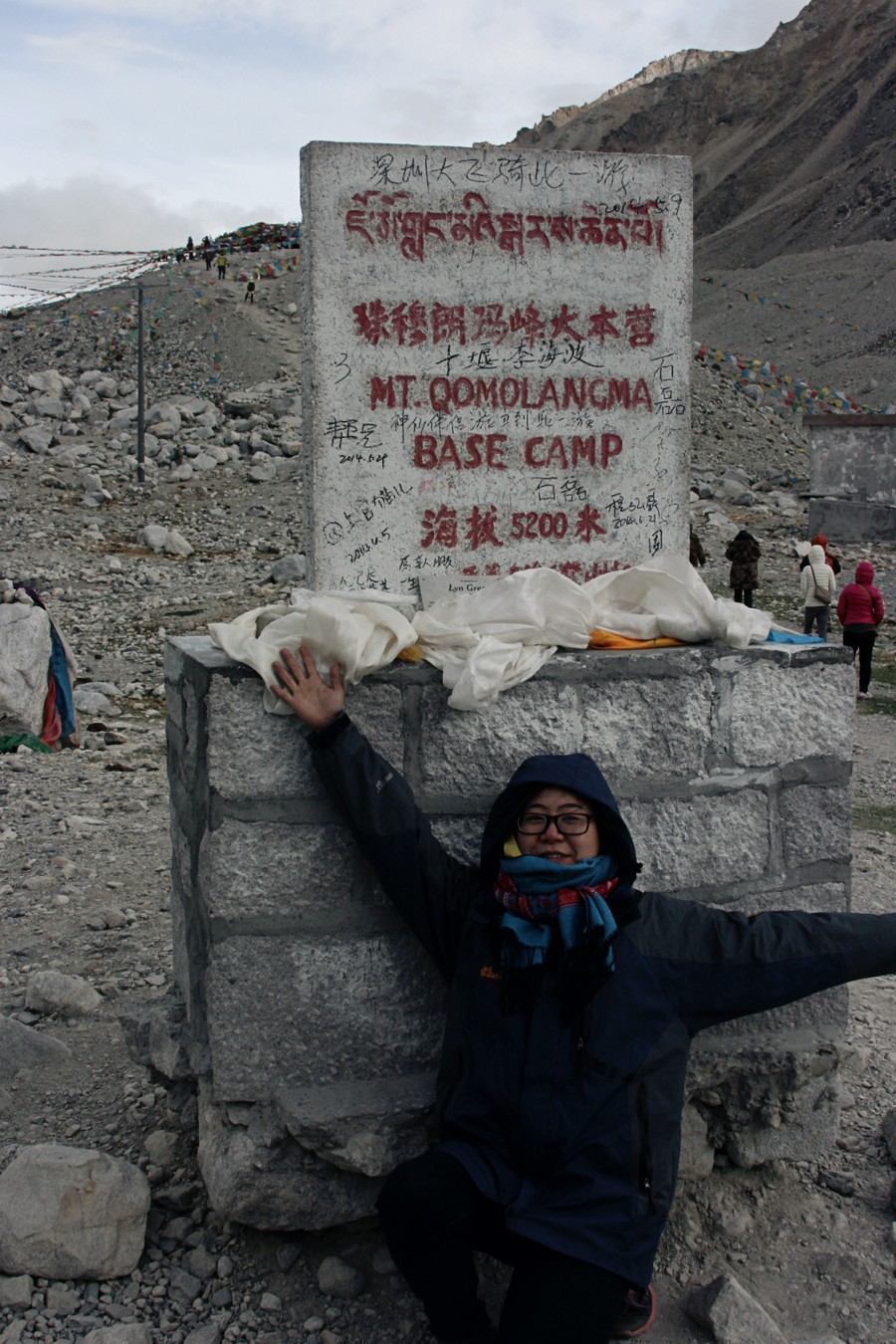 And I managed to snap a picture of me bundling up with the sign of the base camp.